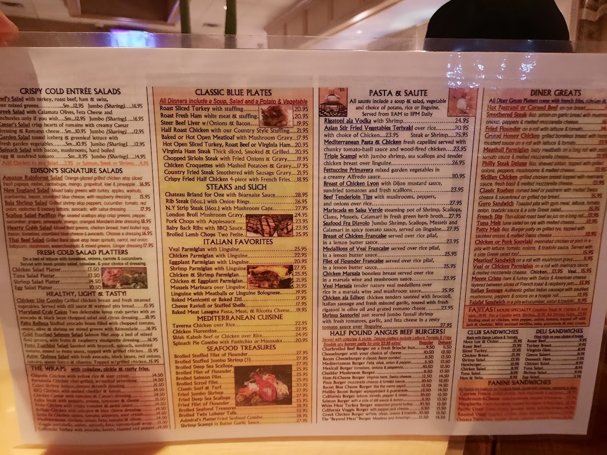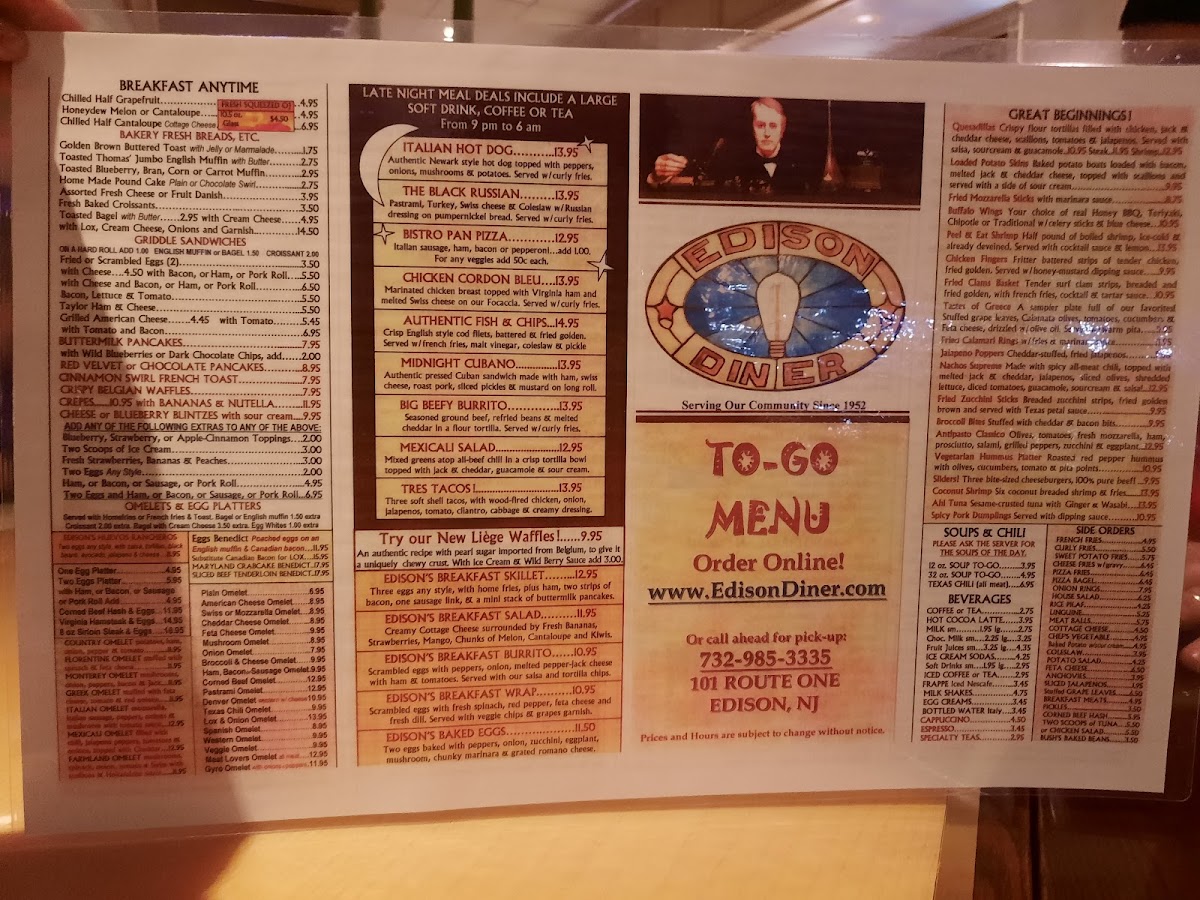 The menu offers a broad selection of classic diner fare, breakfast dishes, and a variety of beverages suitable for different times of the day. It features several well-defined categories, allowing guests to choose from hearty breakfasts, light meals, snacks, and dessert options.